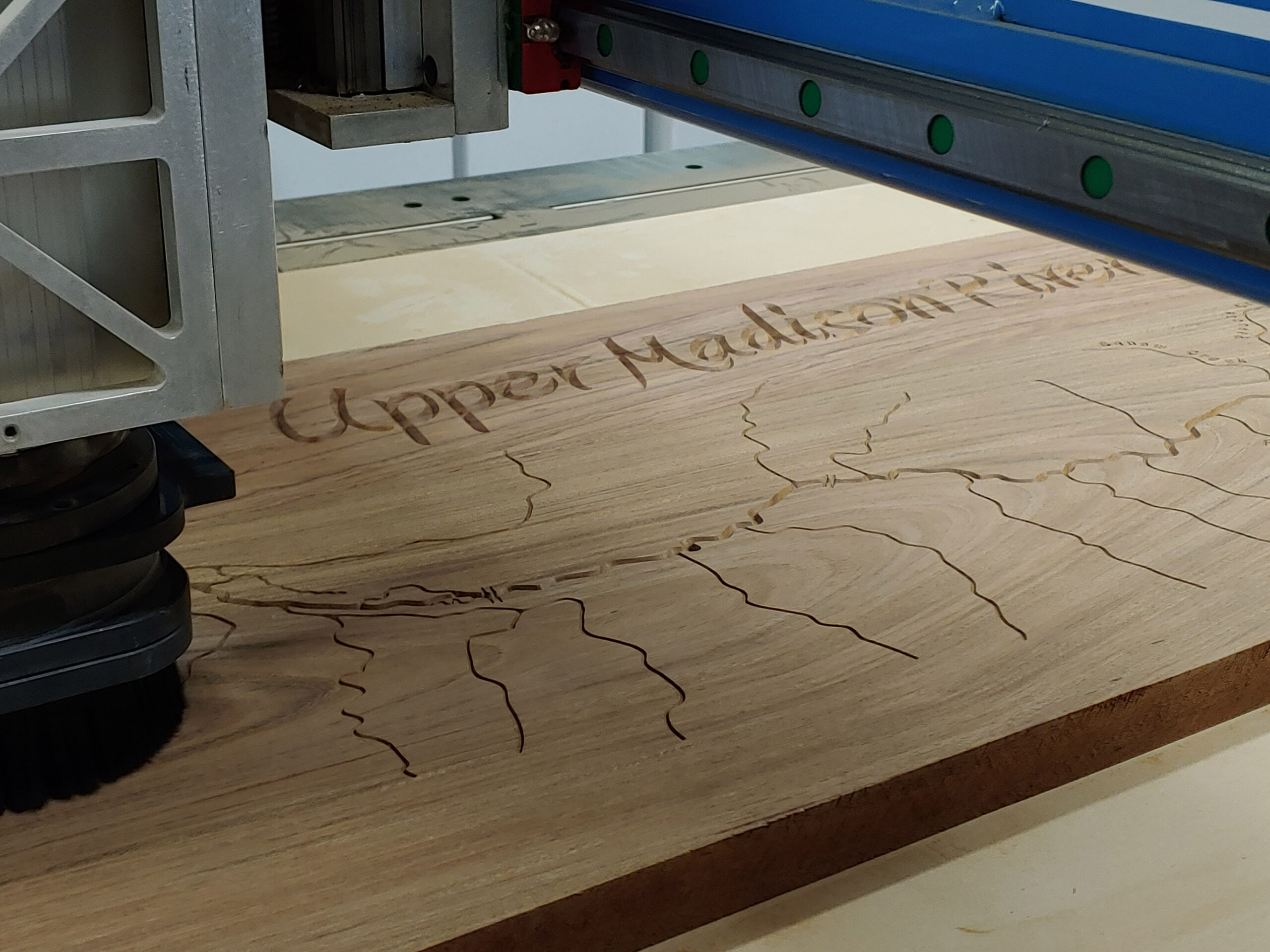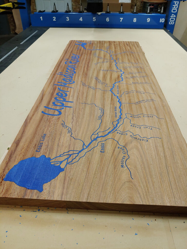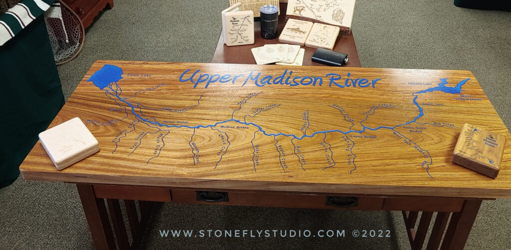 NOW YOU CAN HAVE YOUR FAVORITE RIVER ON A TABLE WHETHER IT’S A BAR TABLE, COFFEE TABLE, OR CONFERENCE TABLE. Just like all our other products, you can choose your river and add personalization. Our Upper Madison River Map Table is on display in our Showroom.