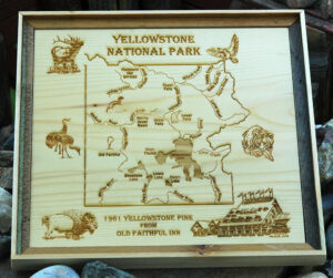 Enjoy all of Yellowstone National Parks Major Fly Fishing Rivers on one plaque. Our map also depicts some of the Park’s famed wildlife. The Old Faithful Inn Artwork was drawn especially for Stonefly Studio’s Yellowstone National Park Plaque Series from Old Faithful Inn Wood by Montana artist Millette. The wood for the 12×12 plaque is 1961 Yellowstone Pine which was used in the rebuild work of Old Faithful Inn after the Hebgen Lake earthquake in 1959.